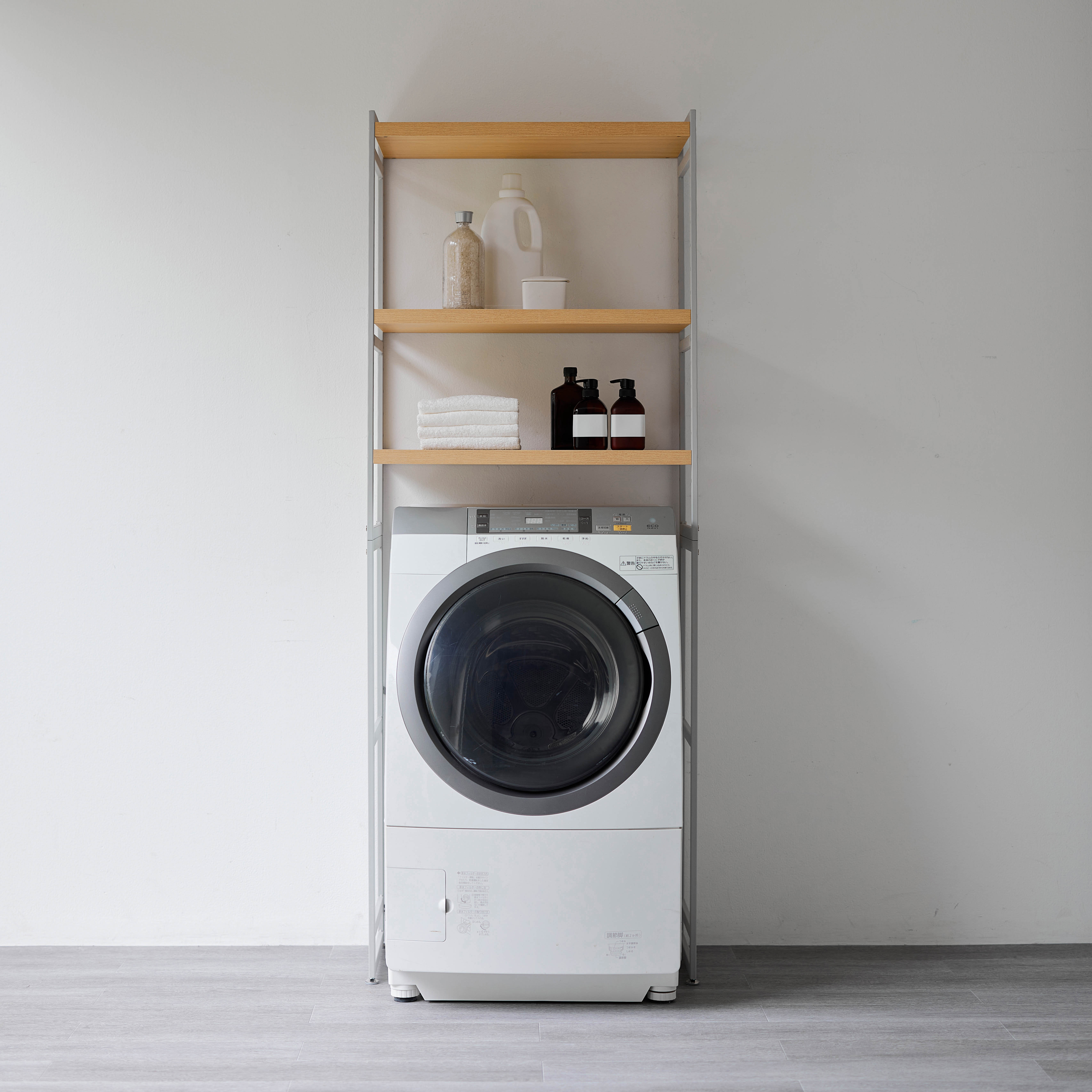 どんなインテリアのランドリーにも馴染みやすい、スタイリッシュな洗濯機上ランドリーラック