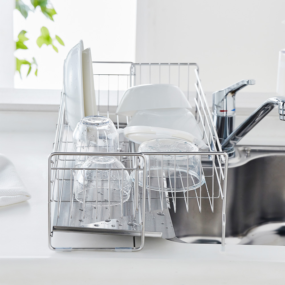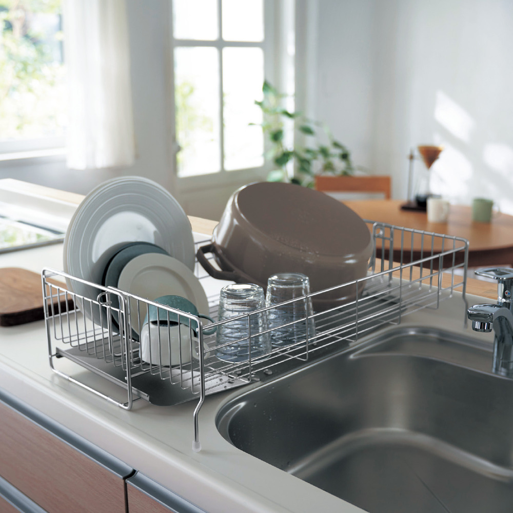 洗い物が少ないときはシンク横のスペースにコンパクトに設置洗い物が多いときはシンクの上をまたいで容量を広げられます。浅型タイプはお皿をきちんと立て掛けて並べられる皿立て付き浅型タイプは背が低いためキッチンで目立たず、お皿の出し入れもしやすいです深型タイプは大皿やフライパンなど大きいものも安定して置きやすいですトレイは傾斜付きで、水がシンク内に流れる仕組み丈夫で錆びにくくお手入れしやすいステンレス製)