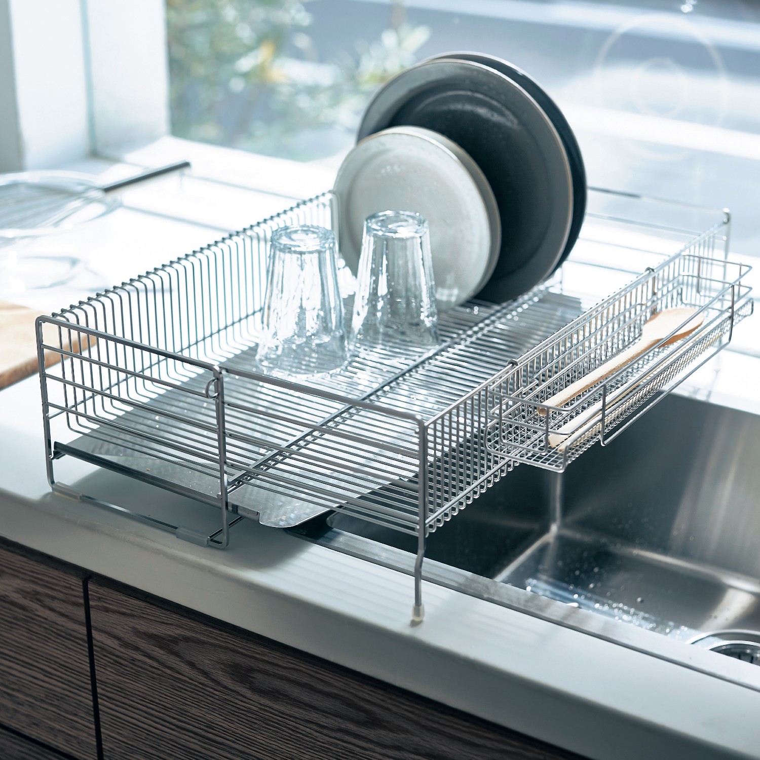 家事を家族で分担するご家庭が増えてきました。食後の食器洗いもそのひとつ。だから、誰にでも使いやすい水切りかごがあれば助かります。これは燕三条製の水切りで、美しい輝きを放つステンレス製。サイドと底のワイヤーがお皿をしっかり受け止めるから、フチのある平皿が立ちやすい構造になっています。ふと手が触れたとき傷つかないように、ワイヤーの切断面を丸くしています。洗う食器の数に合わせて横幅を伸縮できます。トレイの水が勝手に流れるので、いちいち水を捨てる手間がいらず、お手入れが楽。シンクに渡して使うこともできます。)