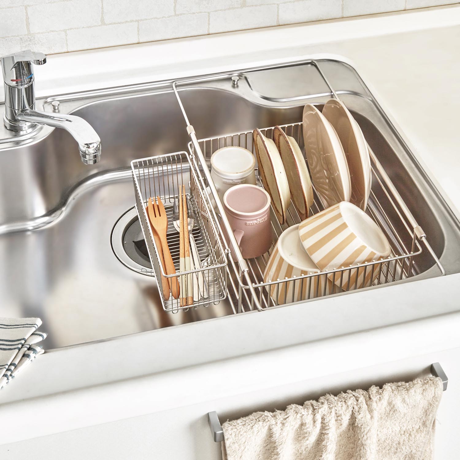 伸縮可能でシンクの内寸約37cm~47cmまでに対応水切れが良く、よく使う、グラス・カップ・茶碗・カトラリー・調理道具などをたっぷり収納スリットを利用してお皿が立てられます。まな板・鍋ふたも立てられます。新発想の二層構造でお皿が立てやすく、置く面がフラットで食器が置きやすい構造菜箸・カトラリー・調理道具などを分別できる仕切り付きポケット)