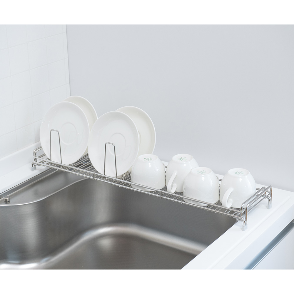 スリムなシンク用の水切りかごですシンクに渡して使用するので、作業スペースも広がります。自立できるのでシンク奥や隙間にコンパクトに収納できます。本体側面に皿立てがかけられます。対応シンク奥行/55cm以下対応キッチン奥行/58cm以上)