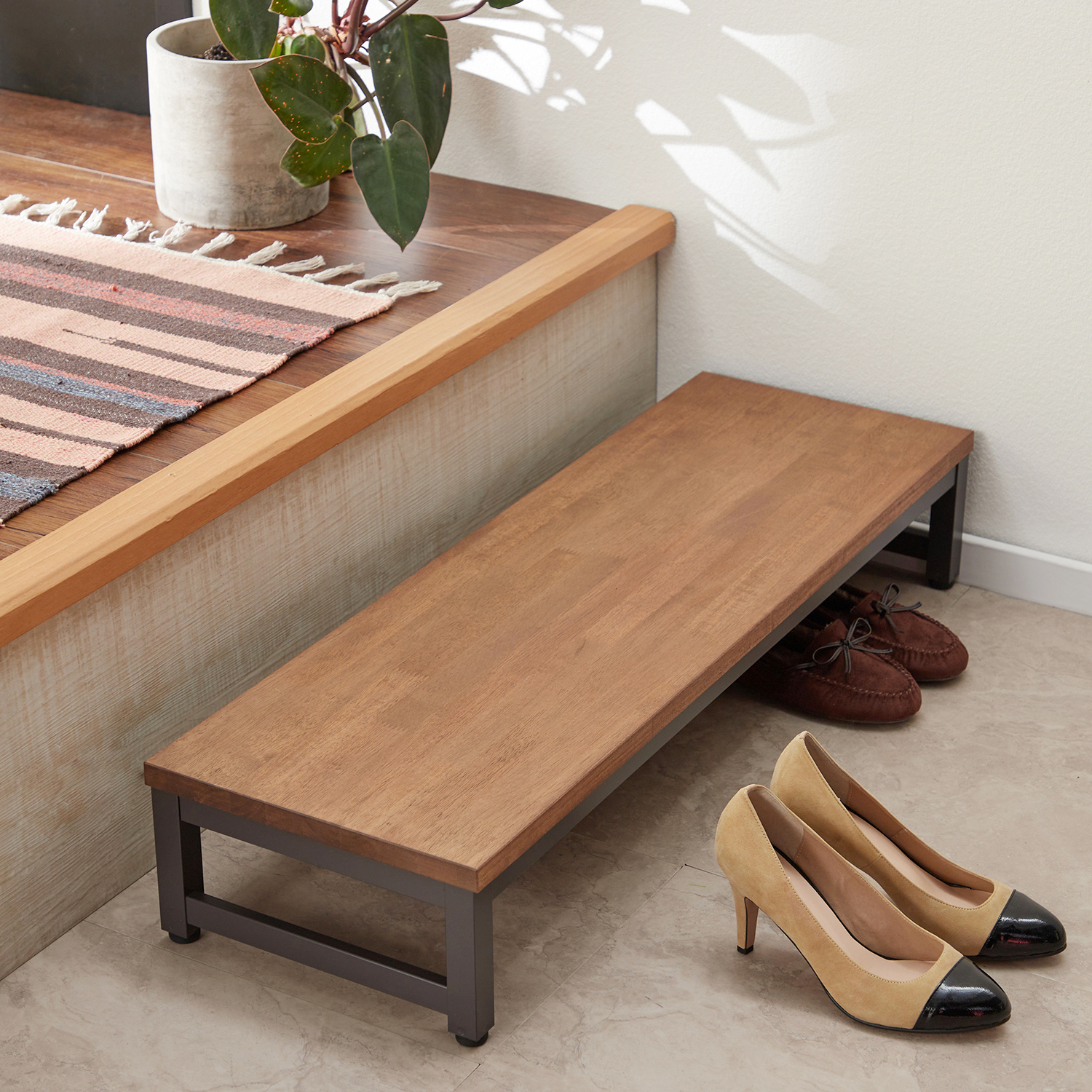 狭い玄関にも置きやすいコンパクトなシューズラックベンチ付きなので、靴を脱ぎ履きする時のチョイ掛けとしても大活躍フレーム部分が手すりとして使えるので立ち座りもラクチンそれぞれ2足ずつ、計4足の靴を収納OKよく履く靴の指定席としてもぴったり)