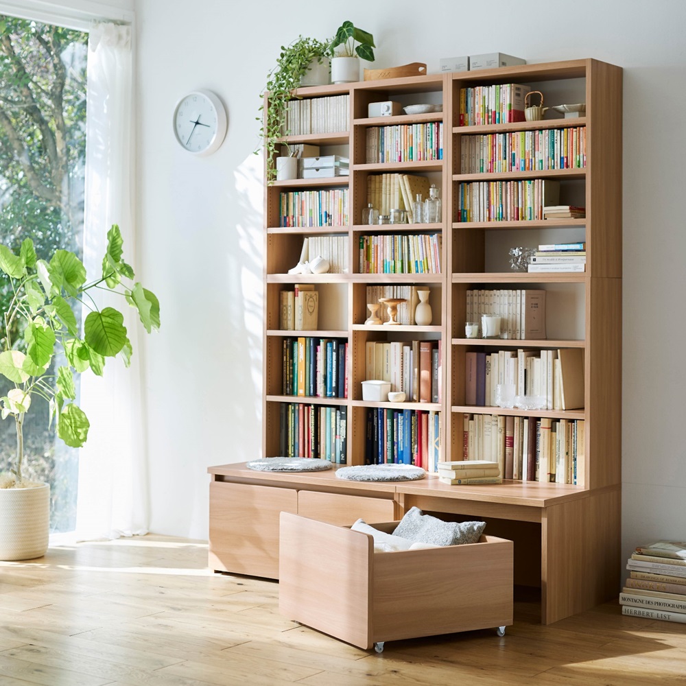 本棚はA4ファイルが収納できる奥行があり、大量の本やアルバムがしまえます)
