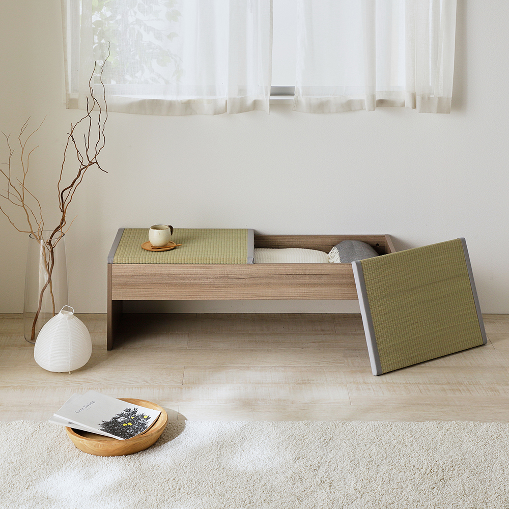 玄関やリビングでの腰掛けとしてはもちろん、複数を組み合わせて小上がりスペースや簡易ベッドとしても活用可能天然い草の香りと風合いが空間に落ち着きを与え、幅広い用途で長く使える、暮らしに寄り添う一台)
