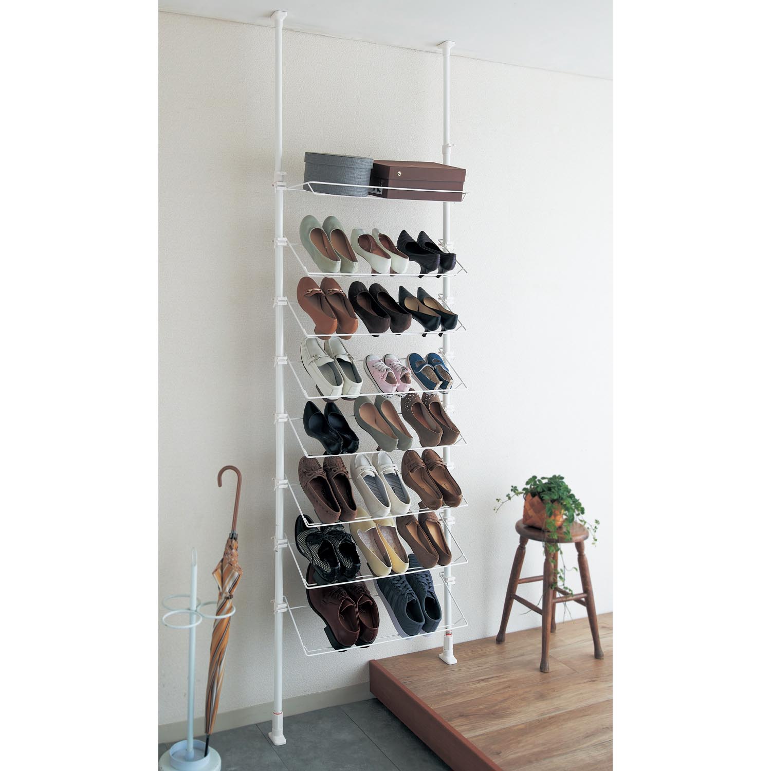 縦のスペースを有効活用しながら収納することができるシューズラックスニーカーやパンプスを約24足たっぷり収納できます。突っ張りタイプなのでしっかり固定でき、少しの段差であれば設置可能棚板は水平置き・斜め置きの2通りから選べ、斜め置きにすればディスプレイするように収納できます。パンプスはヒールをひっかけて収納ができ、倒れて落ちることなく収納できます。棚板の高さも調節できるから、靴以外の収納にも大活躍