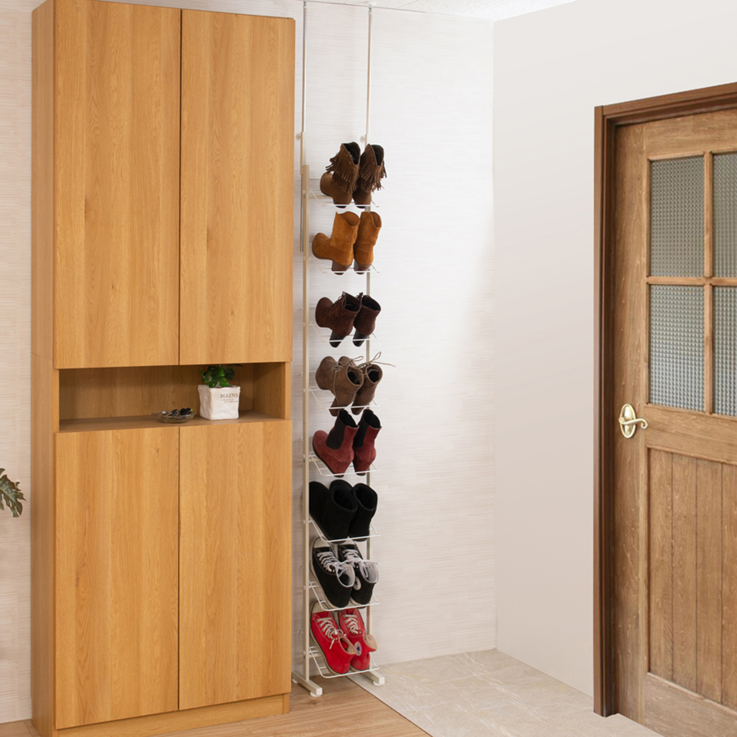 玄関の限られたスペースに設置可能な突っ張り式のシューズラック奥行22.5cmで狭い廊下でも邪魔にならず収納場所を作れます。一目で靴が分かり、さっと取り出せるのも魅力お気に入りのスニーカーのディスプレイとしてもおすすめです棚同士間隔を広く設計されているので、ショートブーツやハイカットが収納可能