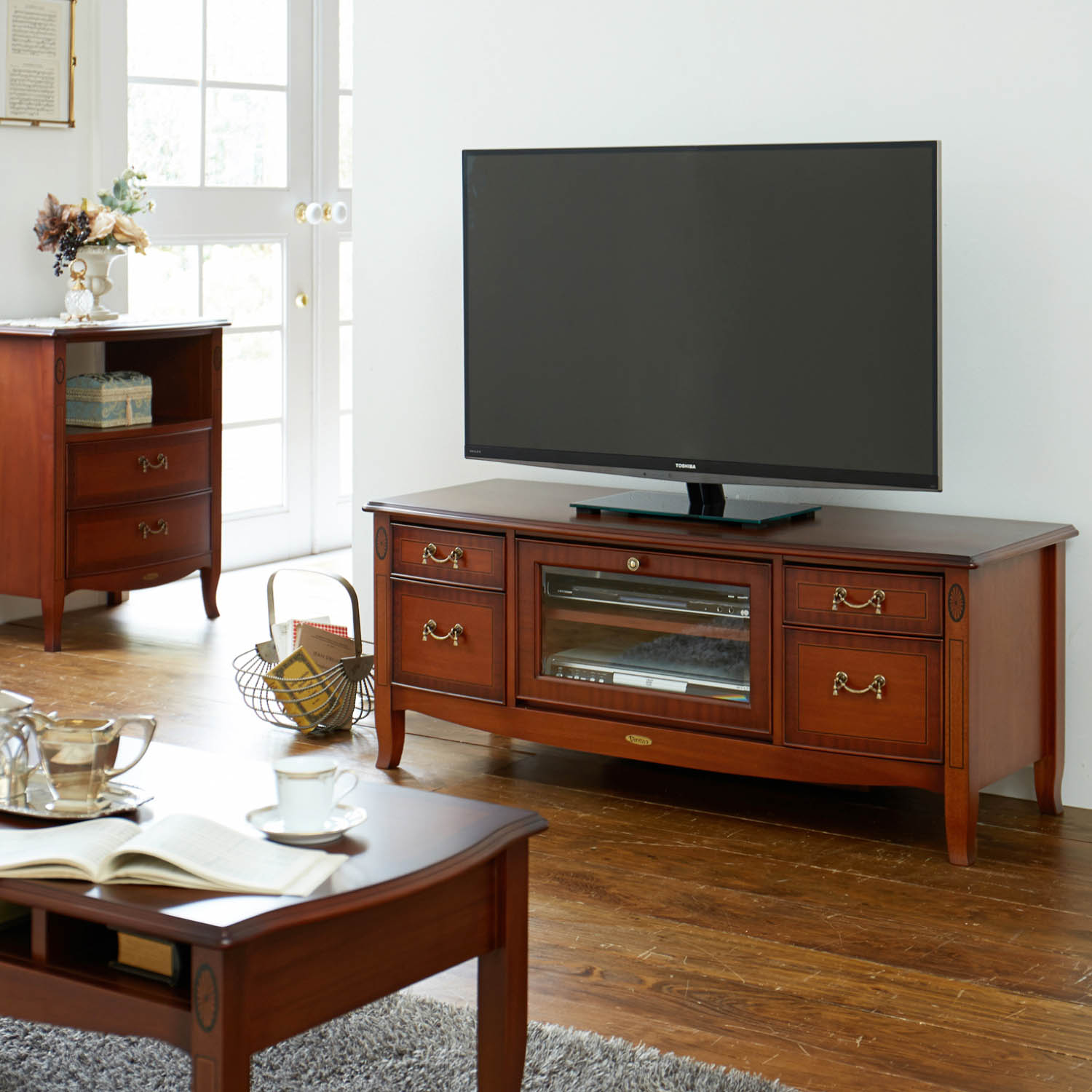 重厚感あふれるマホガニー材とガラスのフラップ扉を組み合わせたモダンなデザイン中は可動棚付きで、2台のデッキを収納でき、背面には配線ボックスがあるので、コードがスッキリします。両側下の引出しは軽い力で出し入れできるフルスライドレール仕様中はソフトやゲーム機などを分別収納できる仕切り板が付いています)