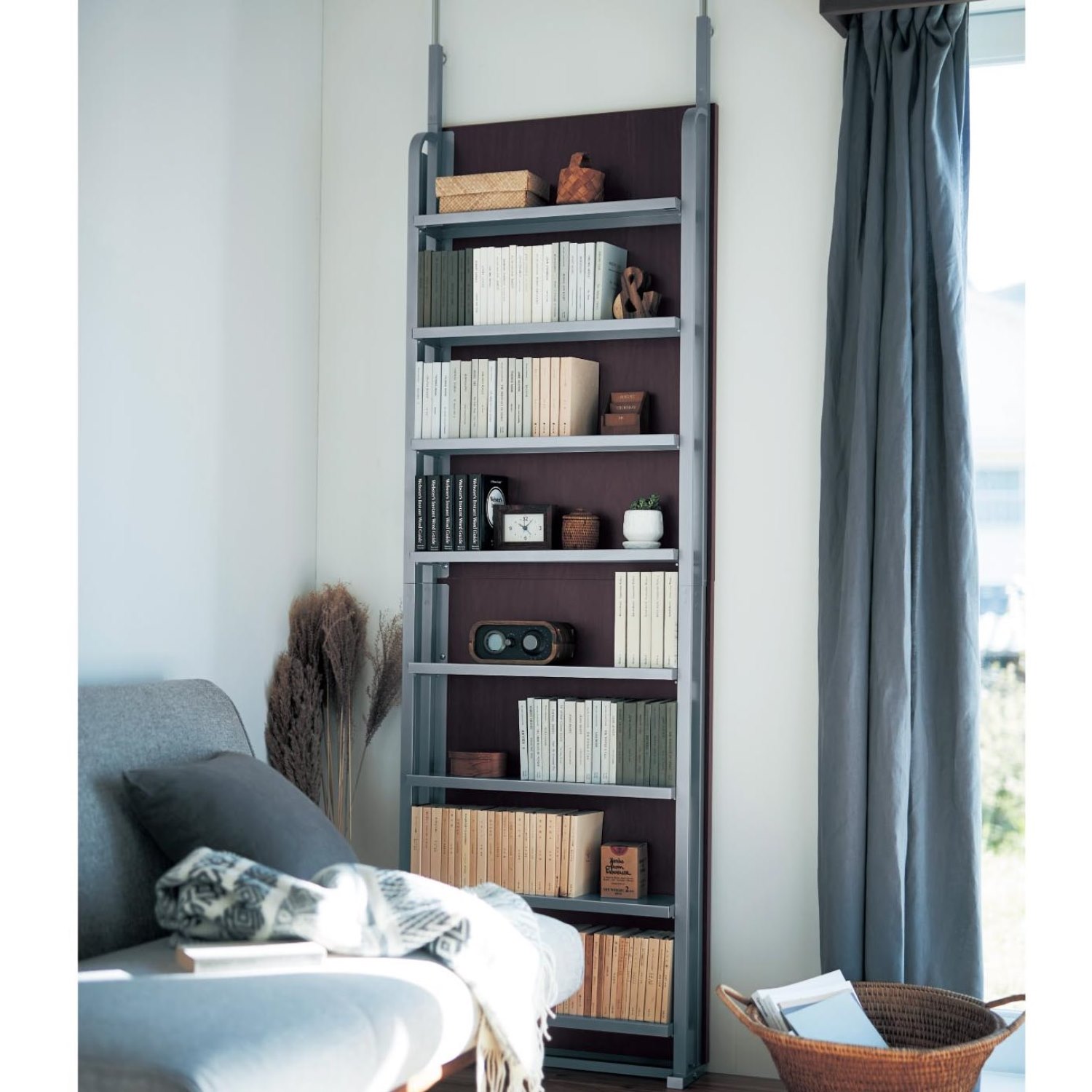 バックボードが付いて、間仕切りとして使える突っ張り式デスクとラックスチールと木目のスマートなデザインですラックを組み合わせることで収納量もアップしっかり補強されたスチール棚なのでたくさん収納できます。)