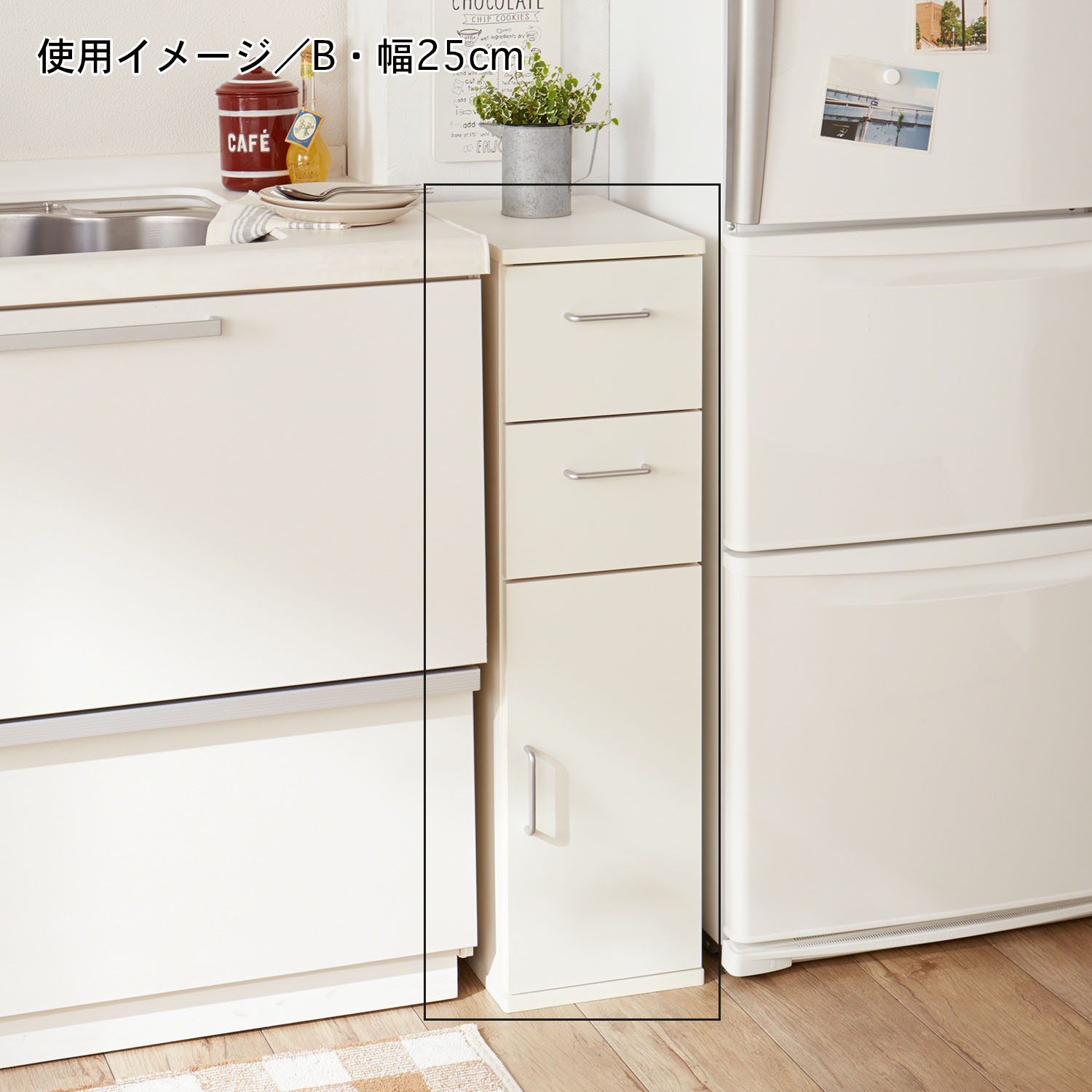 小物類をサッと片付けやすい引出しが2杯と、キッチンならペットボトル、サニタリーなら洗剤のストックなどを出し入れしやすい可動棚付きの開き戸を組み合わせた仕様。A、Bタイプの下段の扉は組み立てる時に左右付け替え可能です清潔感あふれるホワイトでそれぞれ「幅20cm」と「幅25cm」の2タイプをご用意しました)