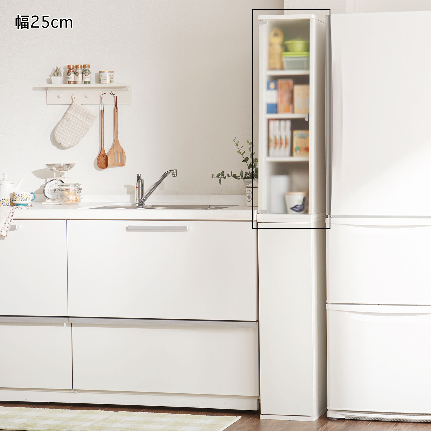 洗剤や食品ストックなどをたっぷり収納できる隙間ストッカーです中に収納したものが見えない板扉見た目もスッキリさせてくれます。可動棚3枚付き可動棚は3cmピッチで17段階に高さ調節OK扉は設置時に右開き、左開きを選べます。「幅20cm」と「幅25cm」の2サイズホワイトカラーが清潔感をただよわせます。別売りの「すき間キャビネット」と組み合わせて使用すれば、収納量がさらにアップ)